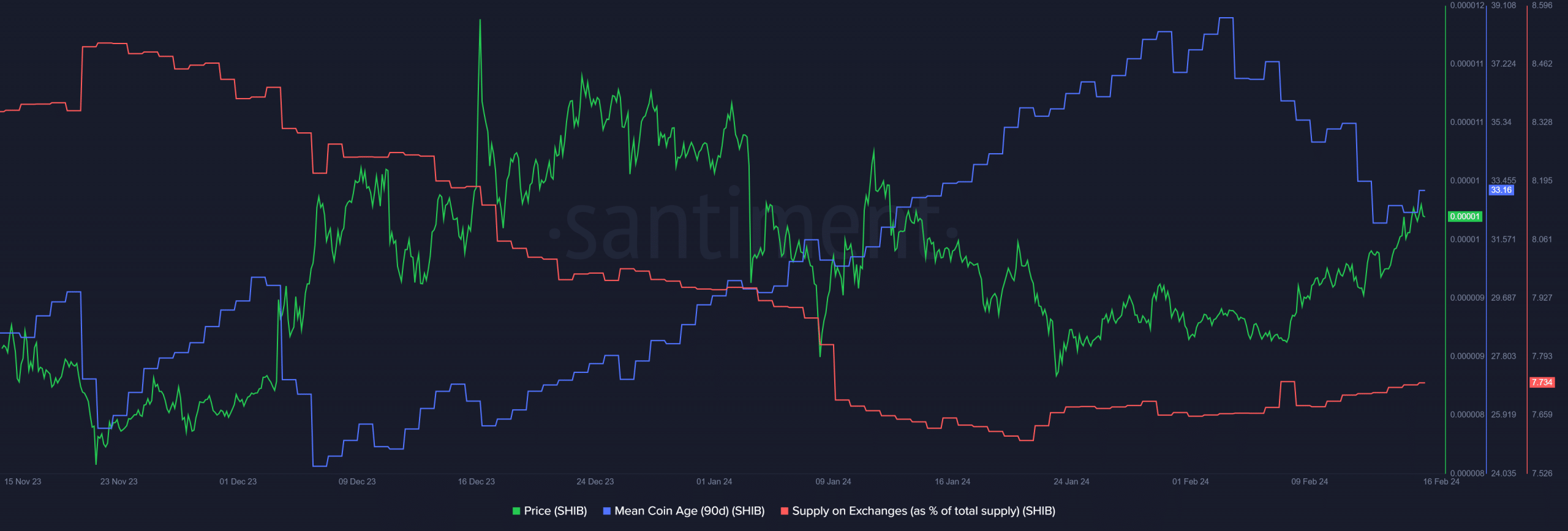 Noticias recientes de que las grandes ballenas $SHIB continuaron acumular La moneda meme supuso un sesgo positivo para las próximas semanas. Esto explicó las grandes ganancias que obtuvo la métrica de edad media de las monedas a principios de 2024.