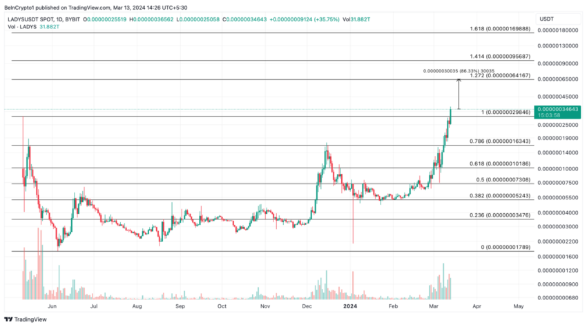 Sin embargo, los analistas emplean los niveles de retroceso de Fibonacci desde los máximos históricos anteriores hasta la parte inferior para predecir posibles resistencias. Existe una resistencia significativa en 0,0000006416 dólar, un nivel clave de Fibonacci de 1,272 dólares. Curiosamente, LADYS podría subir otro 86% antes de toparse con esta resistencia.
