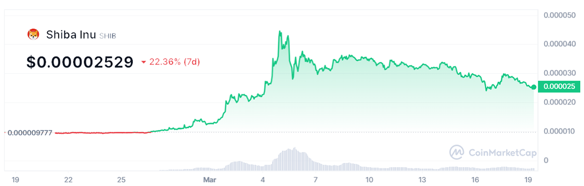 Como consecuencia de esto, el valor de intercambio de $SHIB retrocede aceleradamente durante las últimas 24 horas. En ese período, el token reporta un rendimiento de -10.27%, el cual se extiende a -22.40% en 7 días, según datos de CoinMarketCap.