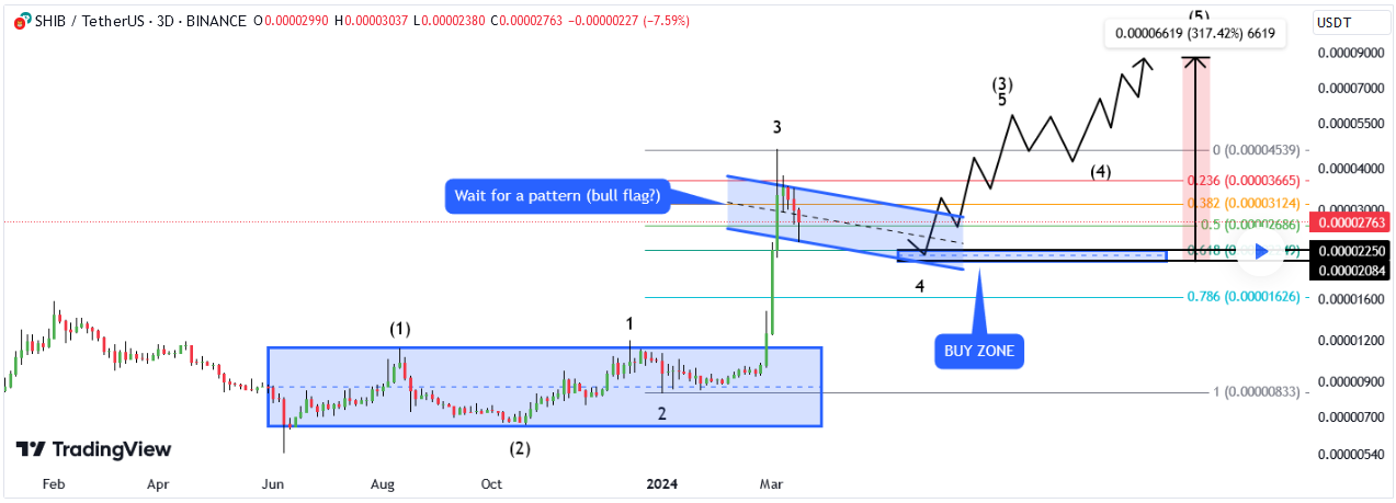Basándose en el principio de que los mercados tienden a retroceder un porcentaje predecible de un movimiento de precios precedente antes de reanudar su trayectoria inicial, Xanrox identificó 0,00002250 dólares como un nivel de precios crucial para adquirir $SHIB antes de una posible subida de precios. Además, Xanrox esbozó un objetivo de $0,00006619, como se muestra en el gráfico, con una mayor acción alcista, según el informe Crypto News Flash.