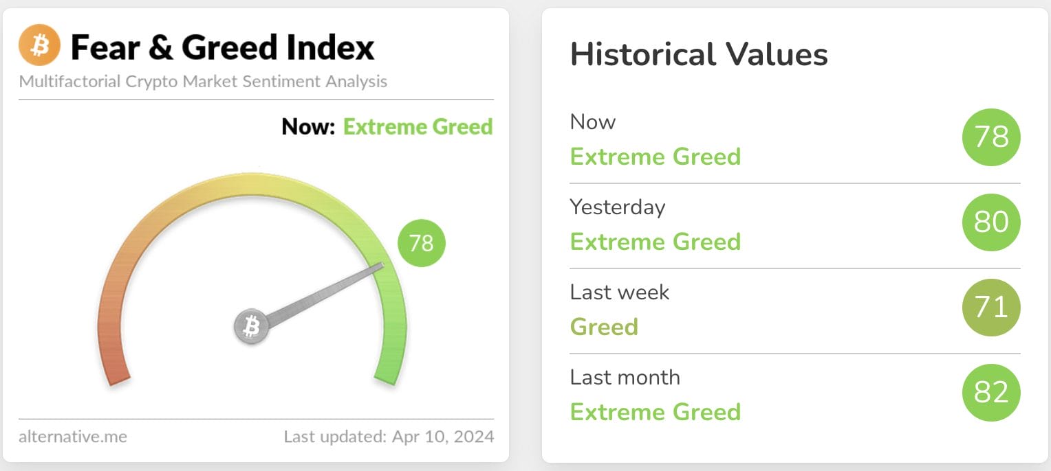 En estos momentos estamos viendo cómo el mercado se mantiene en niveles de extrema codicia con un total de 78 puntos sobre 100. Es decir, el ánimo comprador es potente. Si bien supone una rebaja de dos puntos al respecto del valor del día previo, en comparación con la pasada semana suma 7 puntos, lo que nos devuelve a la parte alta de la tabla:
