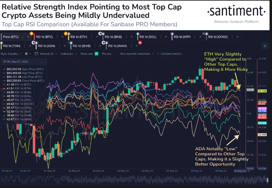 Según datos proporcionados por la plataforma de datos en cadena Santiment el 7 de mayo, Bitcoin, Ethereum y otras altcoins principales parecían estar en la zona de compra. Según el Índice de Fuerza Relativa (RSI), la mayoría de las criptomonedas en el pico de su volumen están mostrando señales de compra.