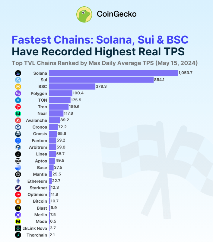 Mientras tanto, con su promedio diario real de transacciones por segundo (TPS) alcanzando un récord de 1.504 el 6 de abril de este año ante la fiebre de las memecoins, Solana ha demostrado ser la gran cadena de bloques más rápida. Como resultado, Solana es ahora 46 veces más rápida que Ethereum y más de cinco veces más rápida que Polygon, la solución de escalado de Ethereum con el mayor TPS.