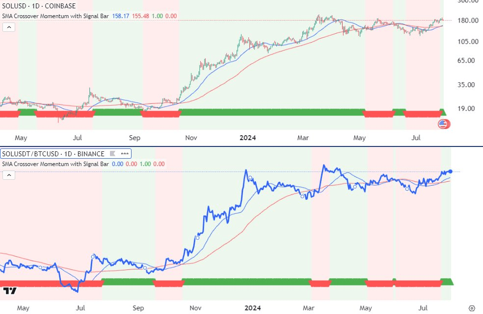 De acuerdo con BitFinanzas, Coutts ha observado que Solana está estableciendo una tendencia ascendente frente a Bitcoin. El par SOL/BTC se encuentra en una posible fase de entrada en una tendencia alcista después de que la media móvil simple (SMA) de corto plazo cruzara por encima de la SMA de largo plazo, un indicador histórico de futuros aumentos.