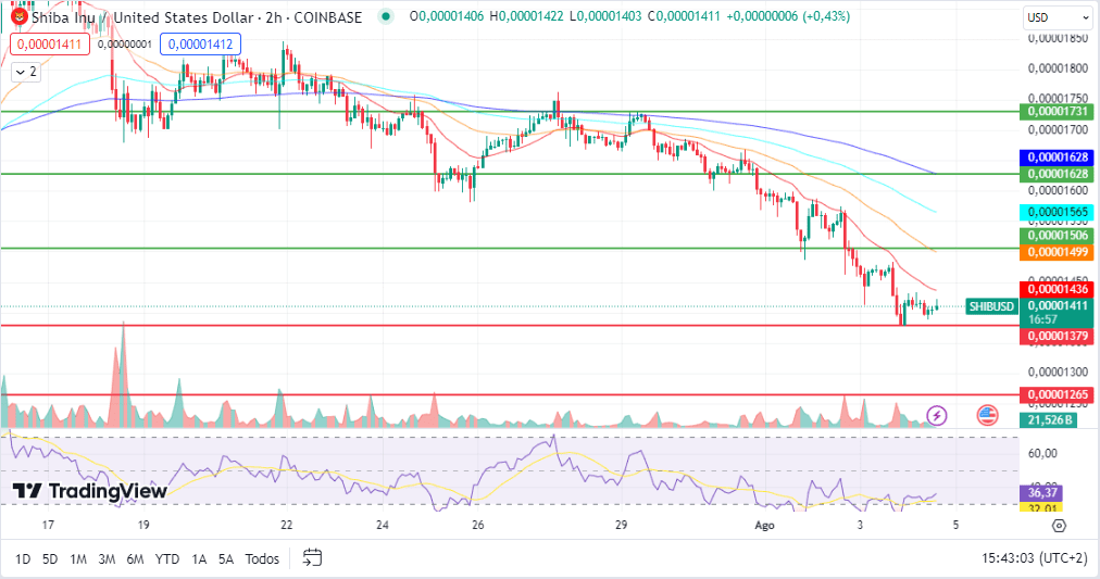 Respecto a los niveles de soporte a vigilar, podríamos fijarnos en primer lugar en la línea de los $0,00001379 o el mínimo de ayer y posteriormente en los $0,00001265.