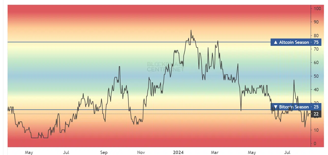Fuente: Blockchain Center El índice de la temporada de altcoins mostró una lectura de 22, lo que significa que era la temporada de Bitcoin. Combinado con los hallazgos anteriores, esto no augura nada bueno para las altcoins. Aunque muchas de ellas podrían rebotar porcentajes de dos dígitos, todavía es probable que el mercado favorezca a Bitcoin debido a la tendencia alcista de Bitcoin Dominance. La confianza en el rey de las criptomonedas ha sido consistentemente mejor que la variedad heterogénea de monedas meme y altcoins que pueblan la lista de los tokens criptográficos más importantes.