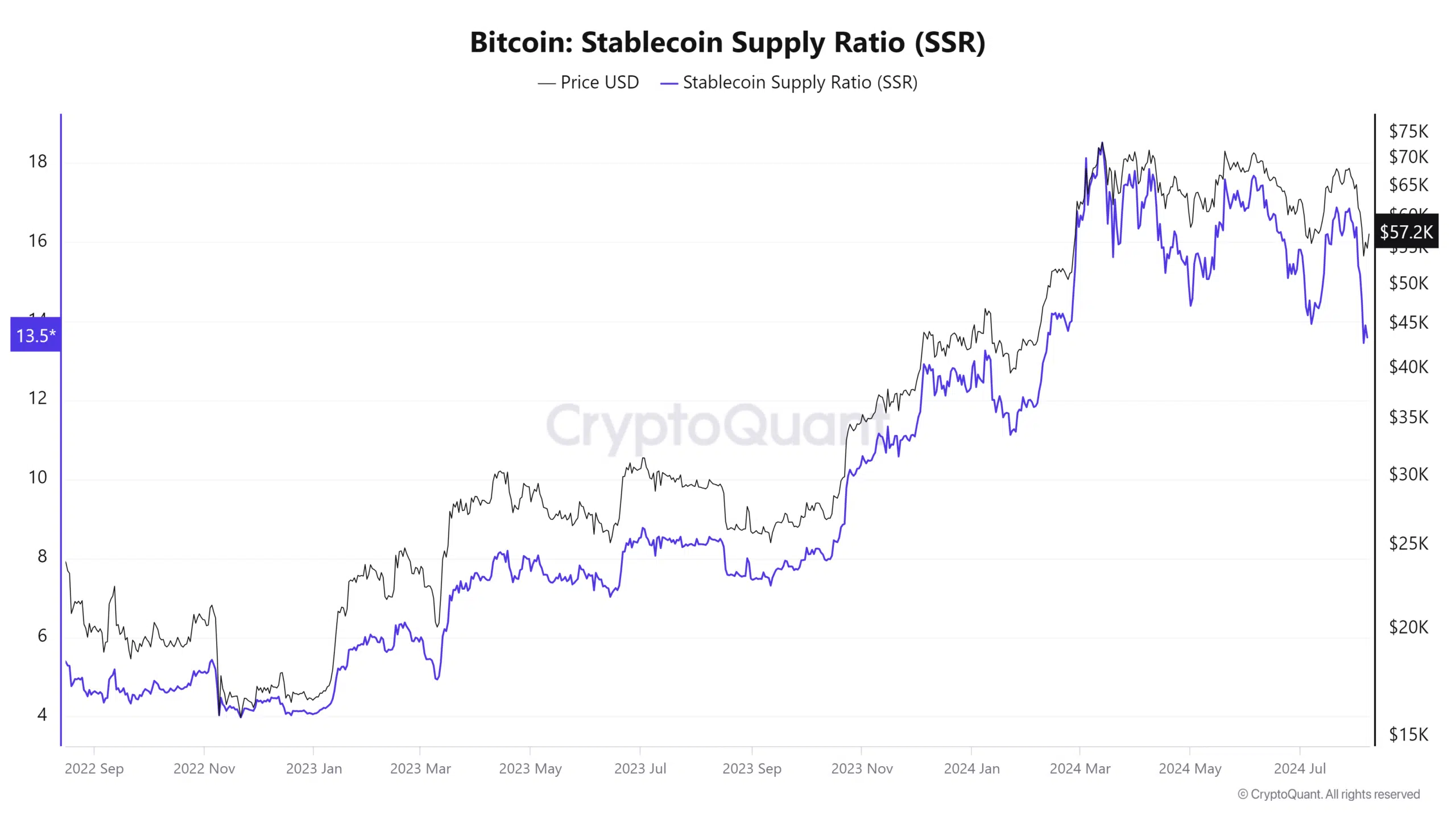 La relación de oferta de monedas estables cayó a nuevos mínimos para el año 2024. Es la relación entre la capitalización de mercado de Bitcoin y la capitalización de mercado de las monedas estables. Una caída en esta métrica significó que hubo una mayor oferta de monedas estables. A su vez, la implicación es que hay un mayor poder adquisitivo. Podría desempeñar un papel clave en la recuperación de Bitcoin y llevar a que $BTC supere al resto del mercado de criptomonedas debido a la tendencia ascendente de $BTC.D. Siguiente: 'Cripto para Harris' gana fuerza: ¿está en marcha un 'fútbol político'?