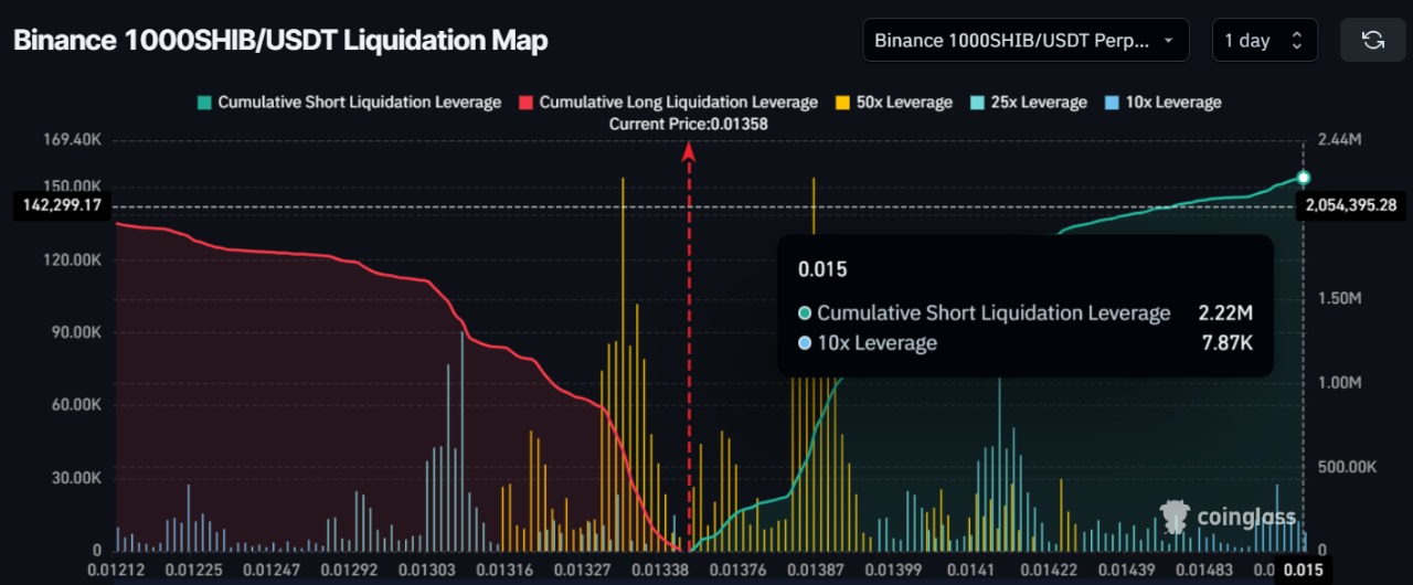 El Mapa de Liquidación de $SHIB proporcionado por Coinglass revela un desequilibrio en la liquidación de posiciones cortas. Esto indica un sentimiento bajista creciente contra $SHIB debido al débil crecimiento de la red y las condiciones generales negativas del mercado.