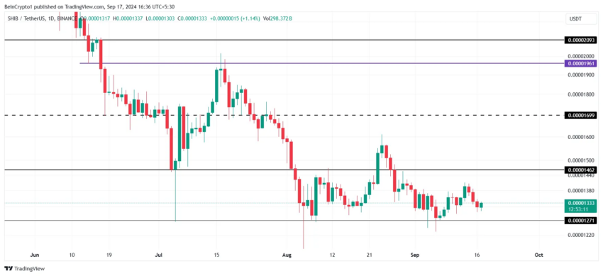 El precio de Shiba Inu ($SHIB) ha estado moviéndose lateralmente, fluctuando entre 0,00001462 dólares y 0,00001271 dólares en las últimas semanas. La altcoin ha estado atrapada en este rango desde principios de agosto, buscando señales alcistas para liberarse y subir.