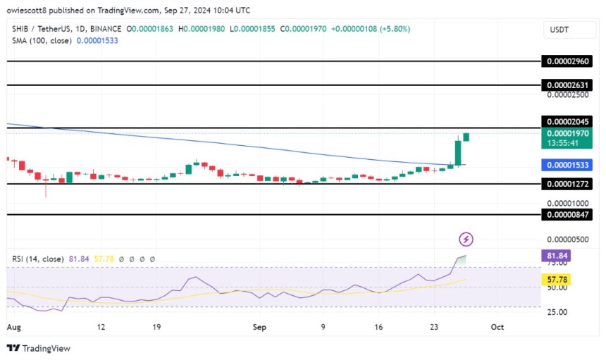 Un análisis del índice de fuerza relativa (RSI) de 4 horas indica el potencial de un movimiento ascendente continuo, con el RSI superando el umbral del 90% y sin mostrar signos de una caída a corto plazo. Esto sugiere que la resiliencia reciente está ganando fuerza y que la tendencia positiva puede persistir. Además, $SHIB superó con éxito la media móvil simple (SMA) de 100 días en el gráfico diario, lo que indica un cambio significativo en el impulso de su precio. Mantener su posición por encima de este indicador demuestra la resistencia del activo y refuerza su sentimiento optimista. El movimiento alcista no es simplemente un pico momentáneo, sino que refleja un fuerte interés de compra y confianza del mercado, lo que sugiere que $SHIB está preparado para obtener mayores ganancias.