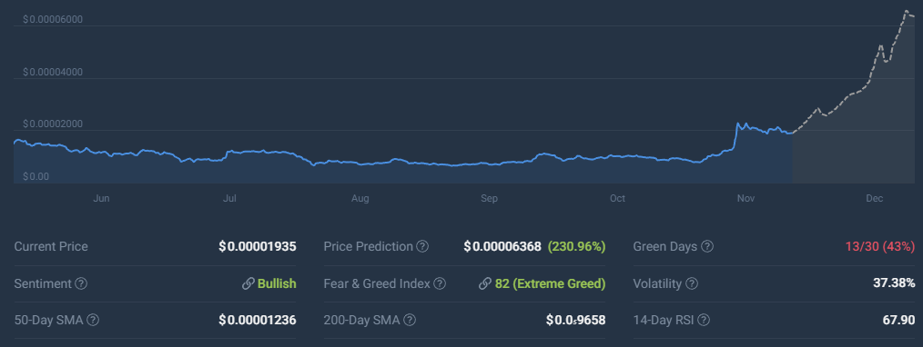 Según el portal CoinCodex, PEPE, podría tener un aumento explosivo en diciembre, aunque su predicción se basa solo en patrones técnicos, sin tomar en cuenta nada de lo fundamental. De todas maneras vale la pena tenerlo en cuenta: