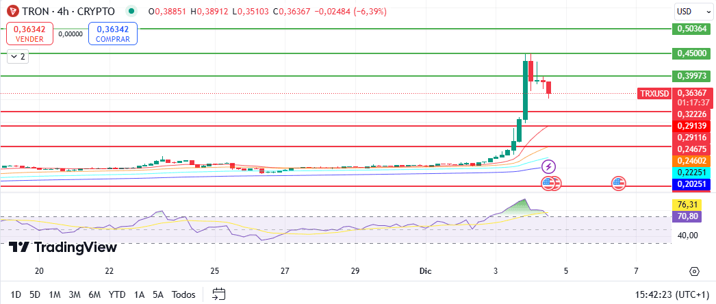 Cabe destacar que en el momento de la redacción el precio de TRX es de 0,359 USD, con ganancias diarias de 56%, semanales de 78% y mensuales de 119%.