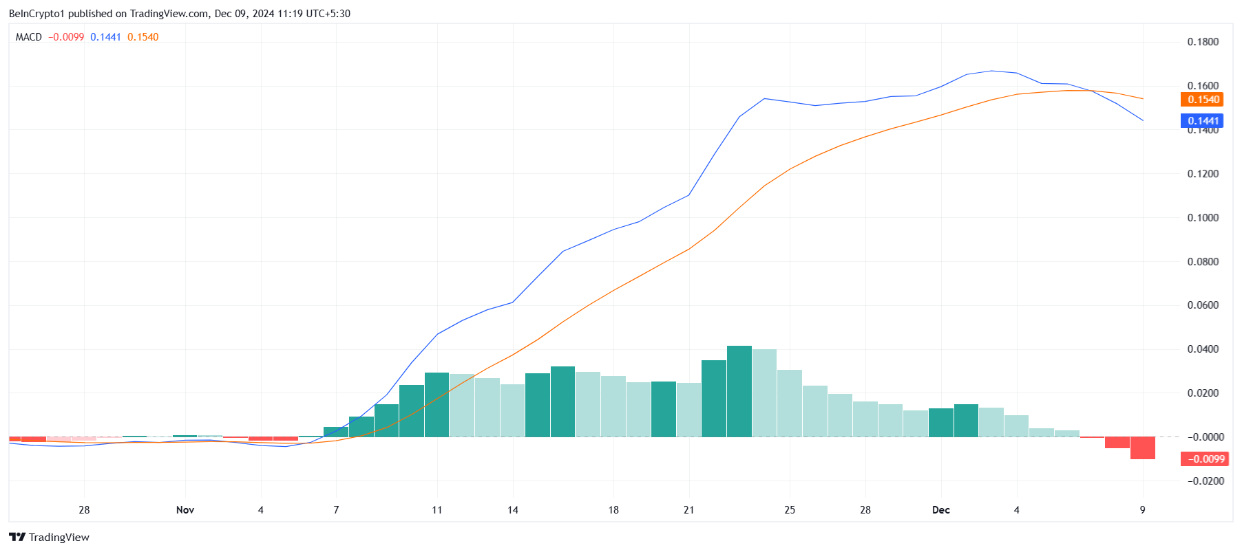 El impulso macro de Cardano también ha cambiado a la baja, como lo indican los indicadores técnicos. El MACD (Moving Average Convergence Divergence) mostró un cruce bajista durante el fin de semana. Esto indica que ADA podría enfrentar una posible caída en el corto plazo.
