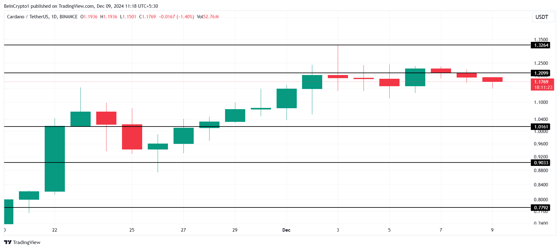Cardano se está negociando actualmente a 1.17 dólares, justo por debajo del nivel de resistencia de 1.20 dólares. Convertir con éxito esta resistencia en soporte podría allanar el camino para un aumento hacia 1.32 dólares.