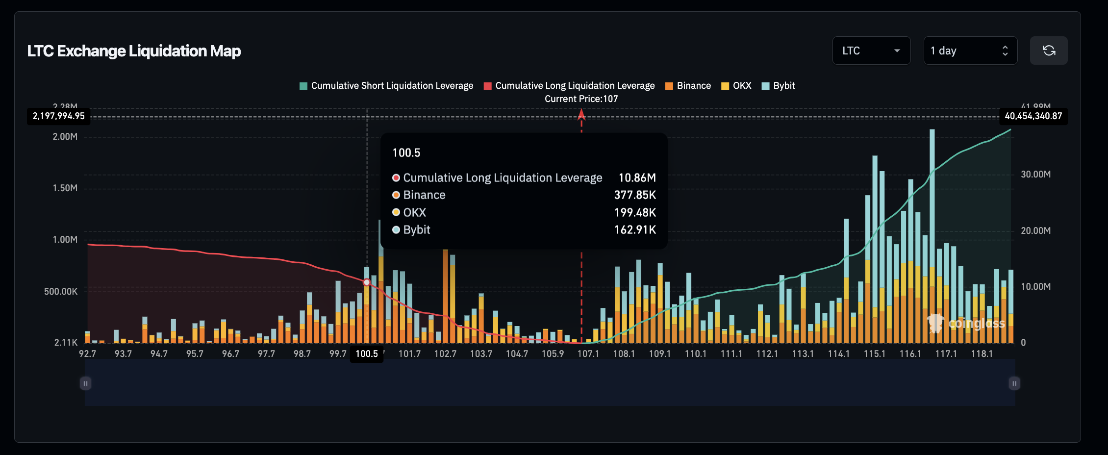 - Los datos de los mercados de derivados muestran que los alcistas de LTC desplegaron 10,8 millones de dólares en apalancamiento alrededor del nivel de soporte de 100$.