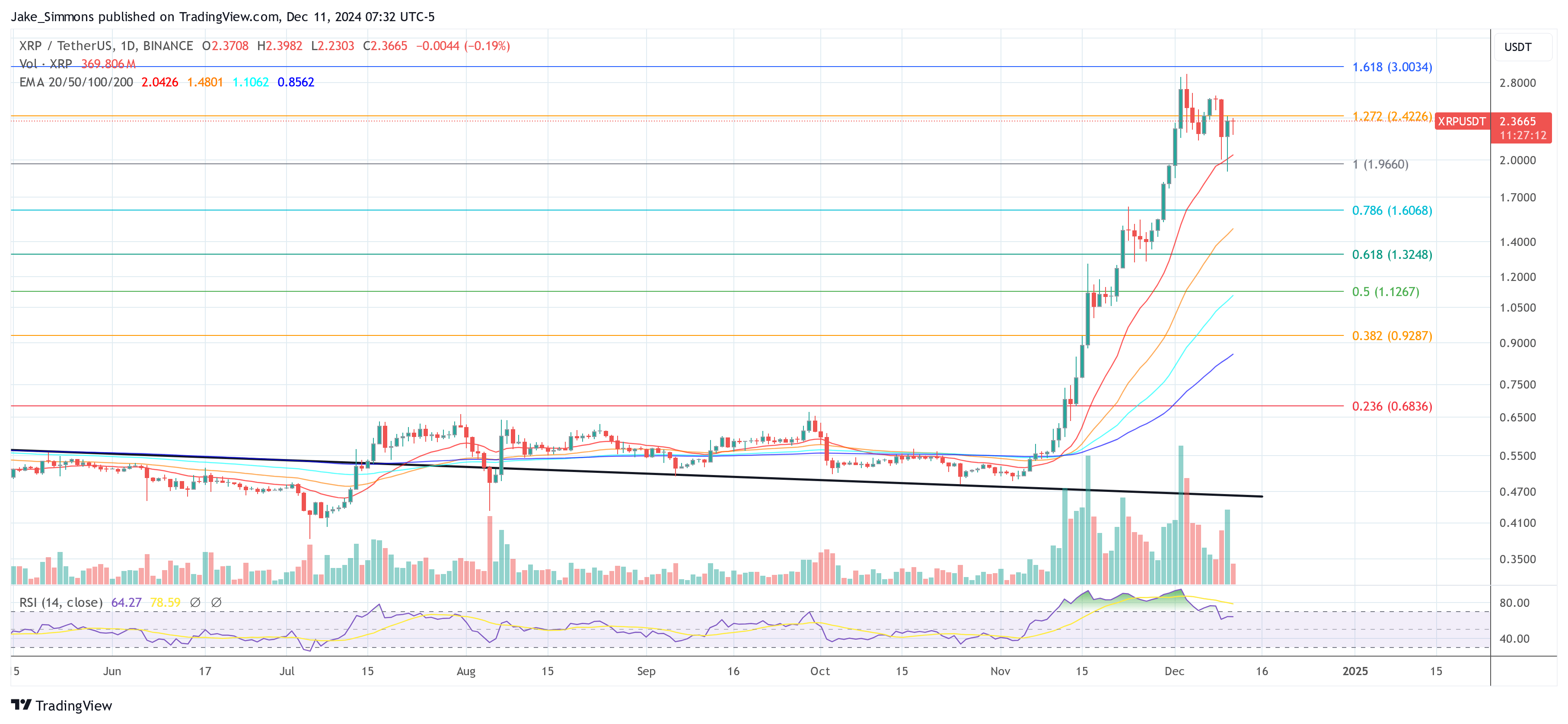 Desde una perspectiva técnica, la estructura de precios de XRP sigue siendo extremadamente alcista en los marcos temporales más altos. En el gráfico diario, XRP logró mantener el soporte por encima del máximo de abril de 2021 en 1,96 dólares, rebotando rápidamente hacia el nivel de extensión de Fibonacci de 1,272 cerca de 2,42 dólares, donde se mantiene actualmente. Una ruptura sostenida por encima de 2,42 dólares podría reforzar aún más la narrativa alcista.