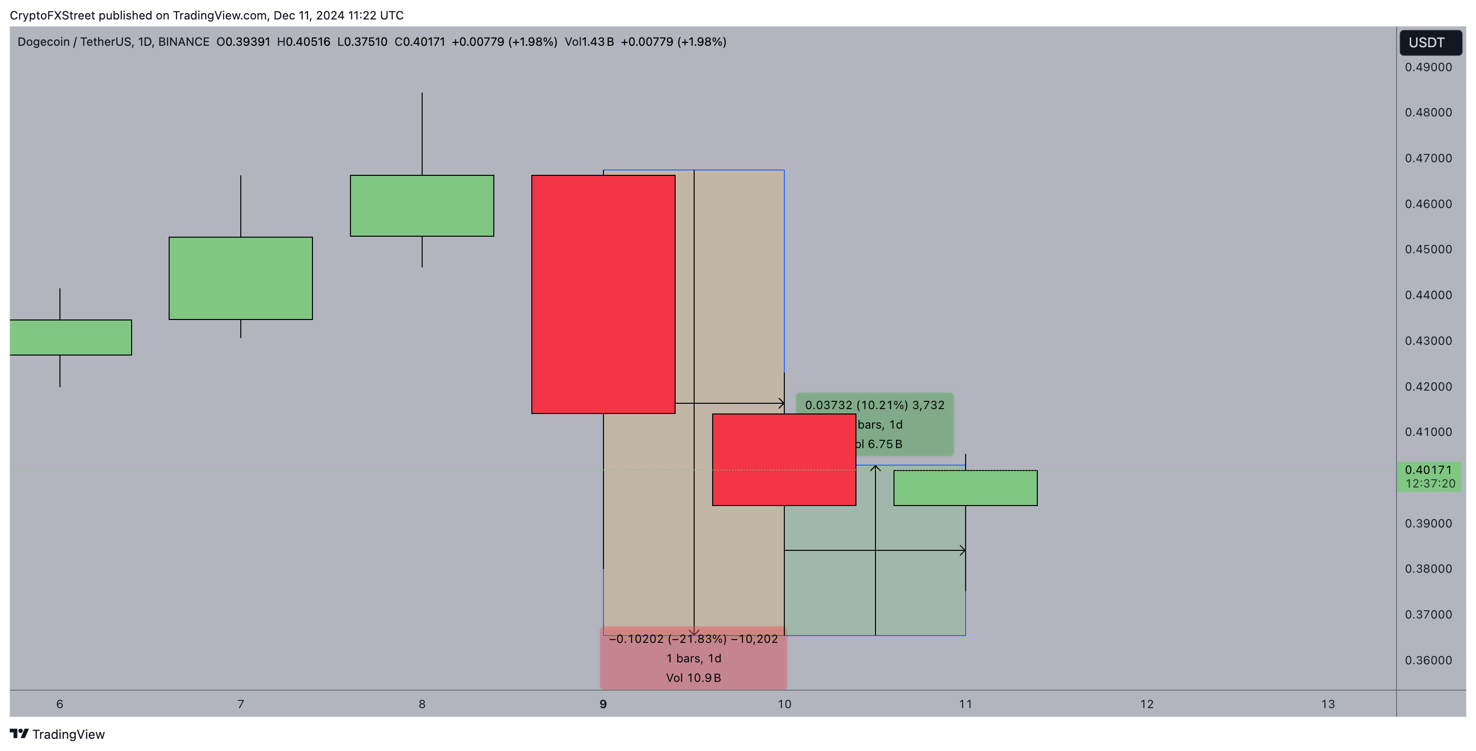 El gráfico anterior muestra cómo el precio de $DOGE ha subido un 10,2% al alcanzar un máximo de 0,41 $ el miércoles. Este impresionante rebote revierte efectivamente casi la mitad de las pérdidas del 21,8% registradas cuando los precios cayeron a un mínimo de 20 días de 0,36 $ el martes.