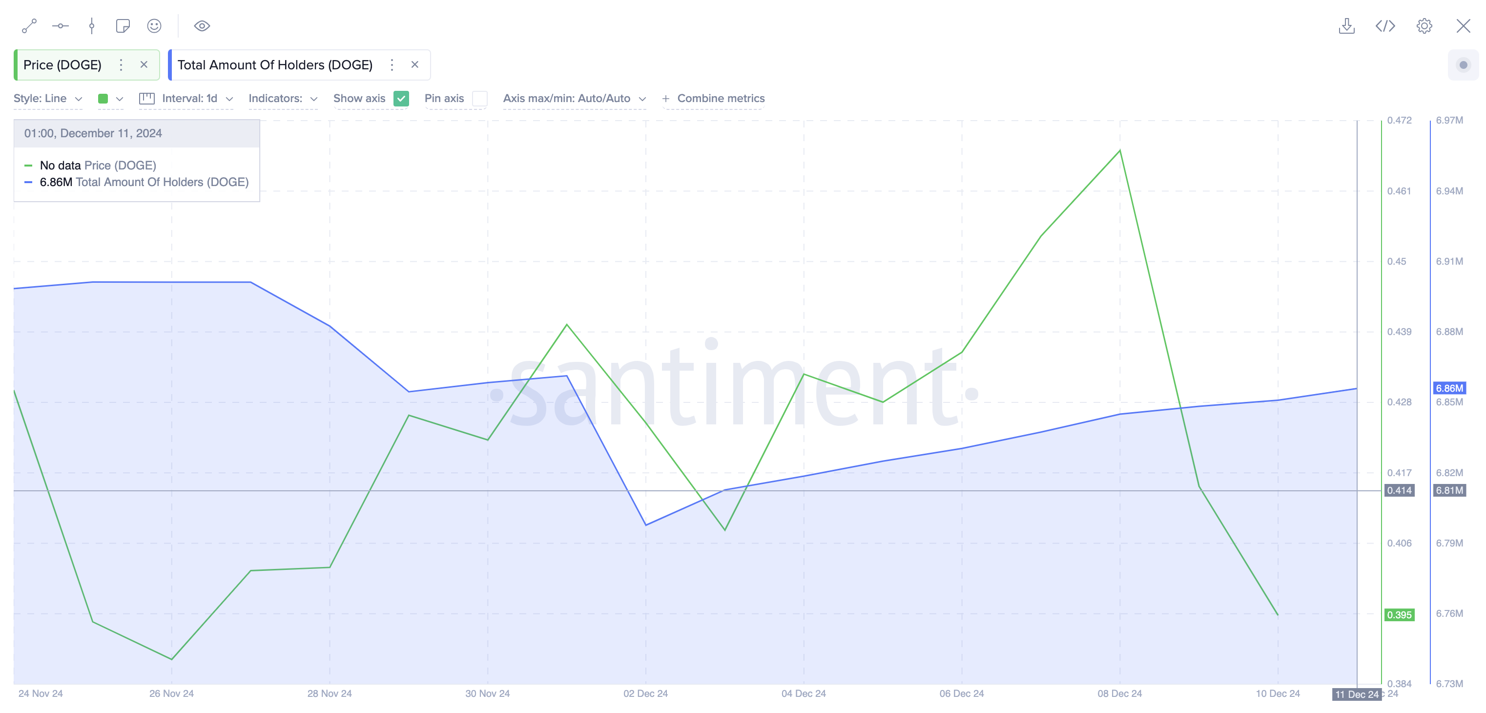 La porción sombreada en azul en el gráfico anterior muestra que solo existían 6,8 millones de carteras en la red Dogecoin al 2 de diciembre. Pero a medida que los mercados de criptomonedas sucumbieron a la volatilidad a la baja durante la última semana, 60.000 nuevas carteras de usuarios adquirieron $DOGE en la última semana, llevando el total de direcciones de tenedores a 6,86 millones al momento de la publicación el 11 de diciembre.