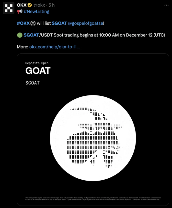 El precio de GOAT saltó aproximadamente 17% después de que OKX anunciara el listado del par spot GOAT/USDT el 12 de diciembre. Este desarrollo se suma a la recuperación en curso del token tras una reciente corrección aguda, alimentando el optimismo para futuras ganancias.