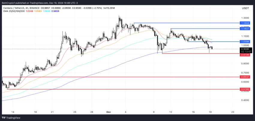 Si eso sucede, el precio de $ADA podría probar el soporte inmediato en 0,95 dólares, y si ese nivel falla, podría descender aún más a 0,65 dólares o incluso 0.519 dólares. Por otro lado, si la tendencia se revierte y el momentum de compra se fortalece, el precio de Cardano podría desafiar la resistencia en 1,03 dólares.