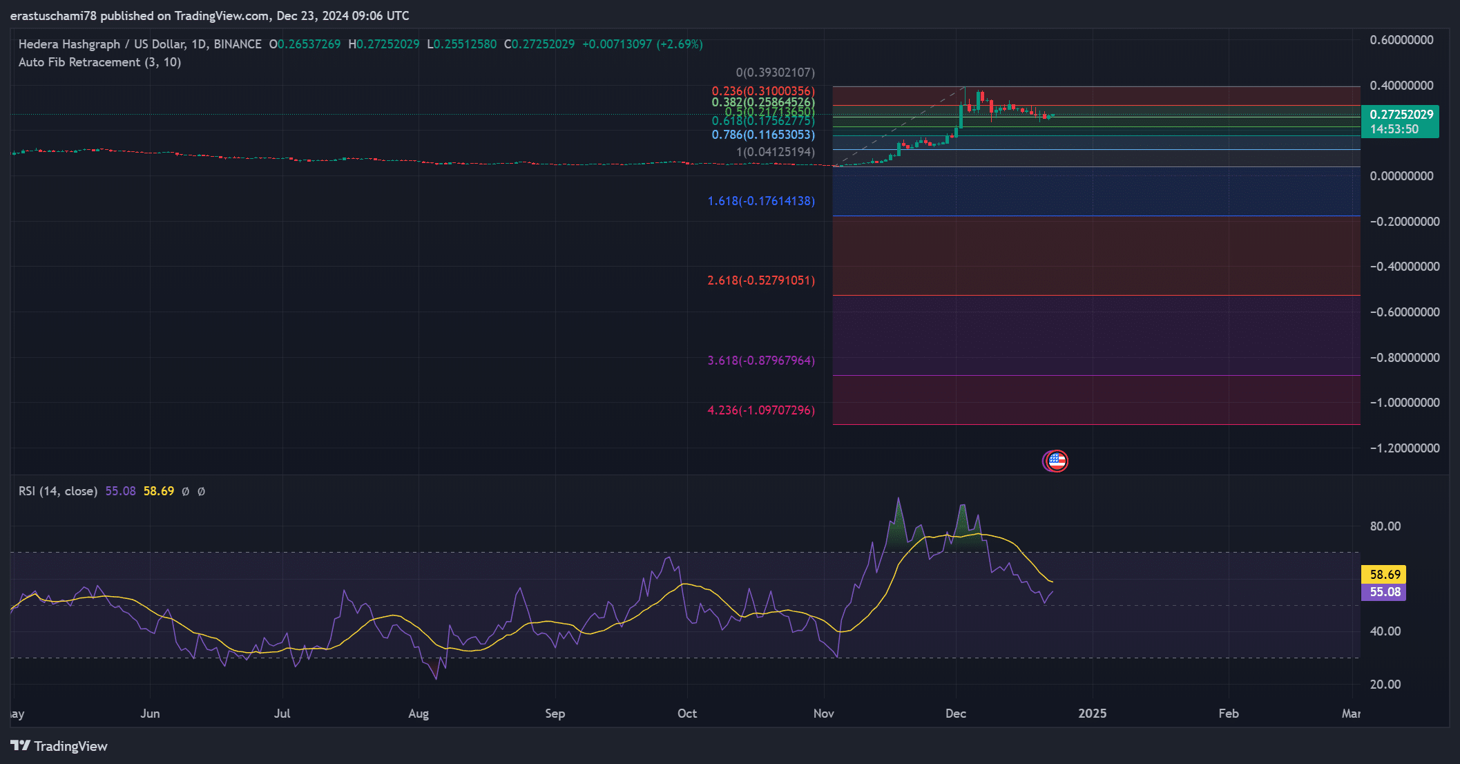 Los niveles de retroceso de Fibonacci resaltan las zonas de precios clave para HBAR. El retroceso de $0,236 cerca de $0,31 sirve como resistencia crítica, mientras que el nivel de $0,382 cerca de $0,28 proporciona soporte a corto plazo. Mientras tanto, el