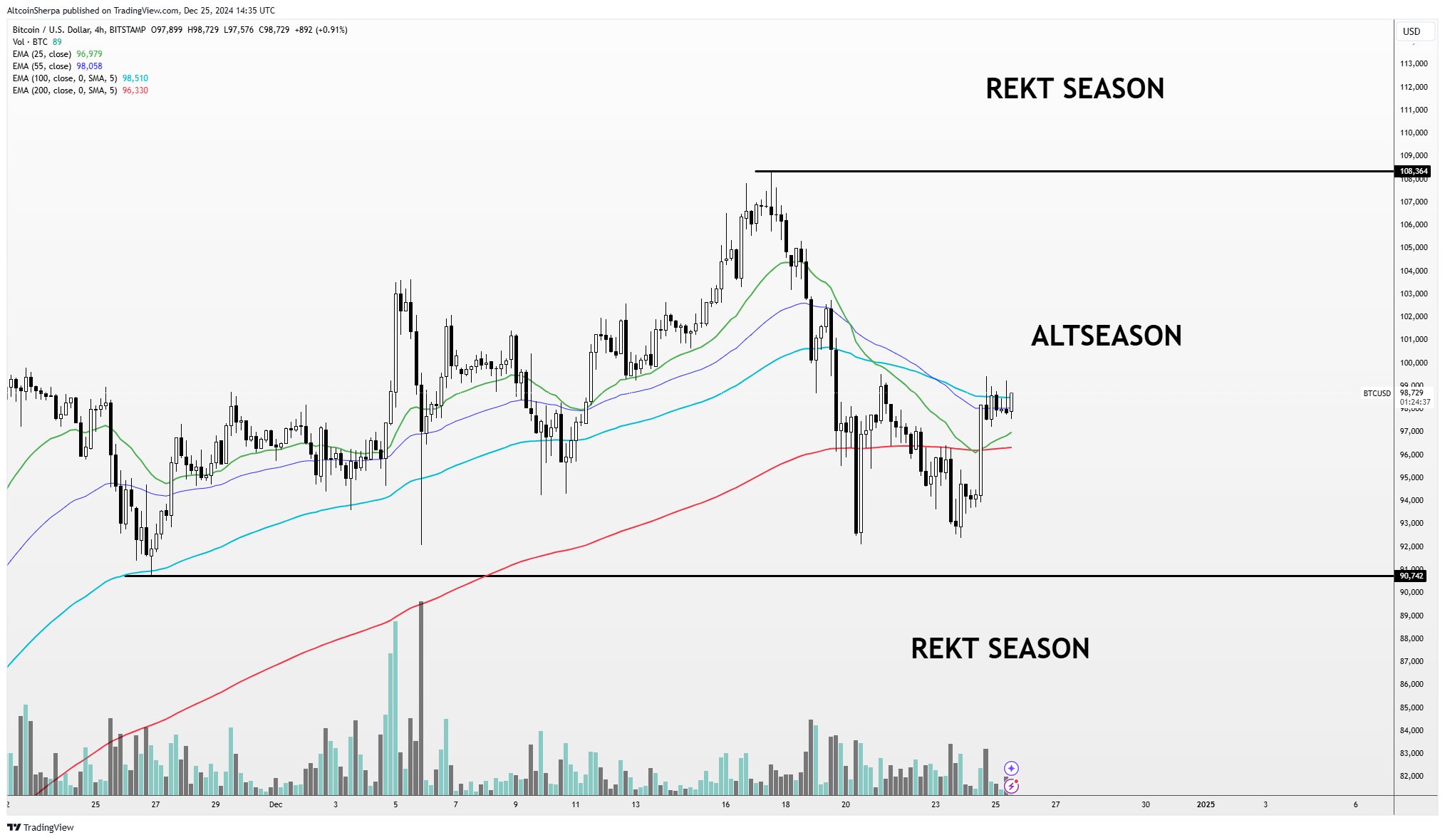 Aunque el valor total del mercado de criptomonedas está en aumento, aún no se observan incrementos sustanciales en los altcoins. A pesar del próximo fin de semana, el mercado de vacaciones no ha visto un resurgimiento en los volúmenes de negociación. Aquellos que esperan un rally de fin de año se están quedando sin tiempo. Aunque BTC recuperando la marca de $98,500 es una señal positiva, se necesita una volatilidad significativa y no se esperan grandes desencadenantes de noticias.