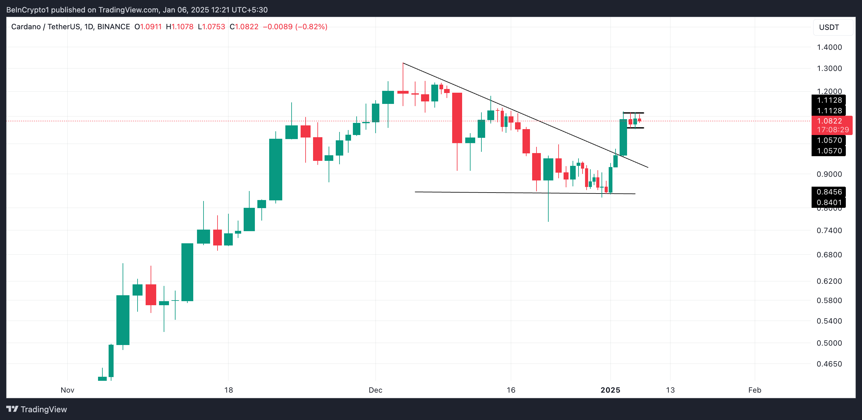 Al momento de la publicación, $ADA se negocia a 1.08 dólares. El creciente sesgo bajista hacia la moneda podría llevarla hacia la zona de soporte de 1.05 dólares. Si los alcistas no logran defender este nivel, el precio de la criptomoneda podría caer por debajo de la marca de 1 dólar para negociarse a 0.94 dólares.
