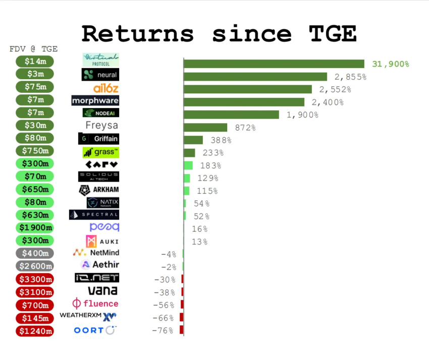 En los mercados líquidos, las valoraciones totalmente diluidas (FDVs) bajas fueron el principal impulsor de altos rendimientos. Entre los 22 principales tokens DePIN, solo cuatro perdieron valor desde su evento de generación de tokens (TGE). Virtuals Protocol mostró un crecimiento excepcional, ganando más del 30,000% desde su TGE.