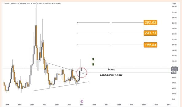 Según el análisis técnico, LTC ha salido de un patrón de triángulo ascendente a largo plazo, que generalmente indica una continuación de una tendencia alcista.