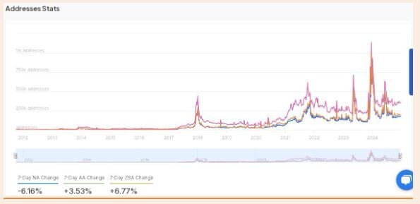 Mientras tanto, las direcciones activas aumentaron un 3.53%, lo que indica que los usuarios existentes siguieron comprometidos a pesar del menor interés de los nuevos participantes.