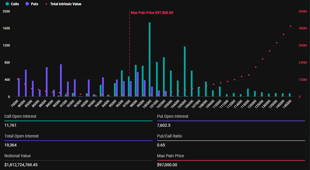 Según datos de Deribit, 19,364 opciones de Bitcoin expirarán hoy, ligeramente por debajo del inicio del año, donde 19,885 contratos de BTC se liquidaron la semana pasada. Los contratos de opciones que vencen hoy tienen una relación Put/Call de 0.65 y un punto de máximo dolor de 97,000 dólares.