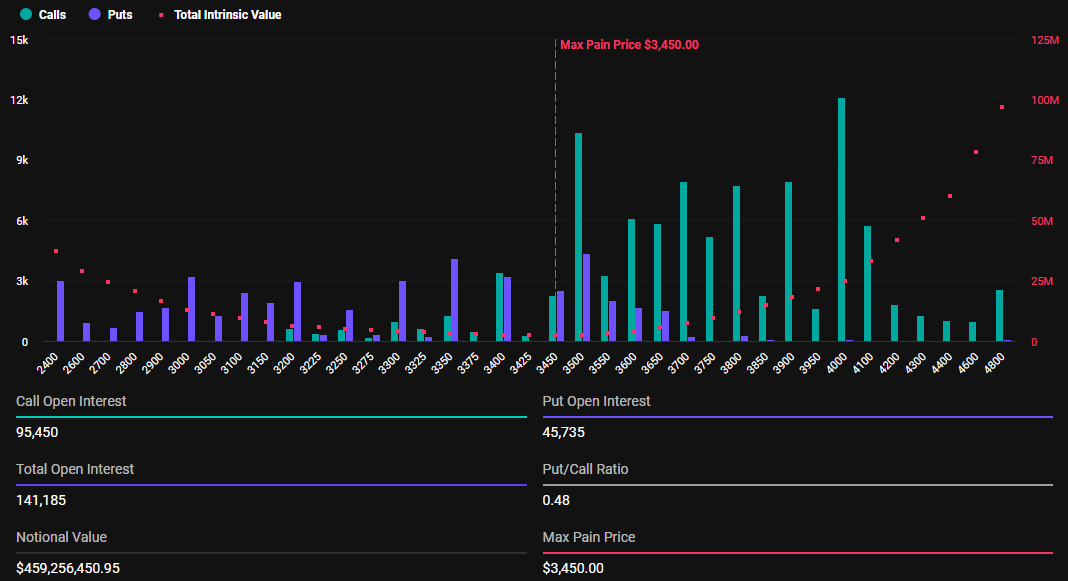 141,185 opciones de Ethereum también expirarán hoy, por debajo de 205,724 en la primera semana de 2025. Con una relación Put/Call de 0.48 y un punto de máximo dolor de 3,450 dólares, las expiraciones podrían influir en el movimiento de precios a corto plazo de ETH.