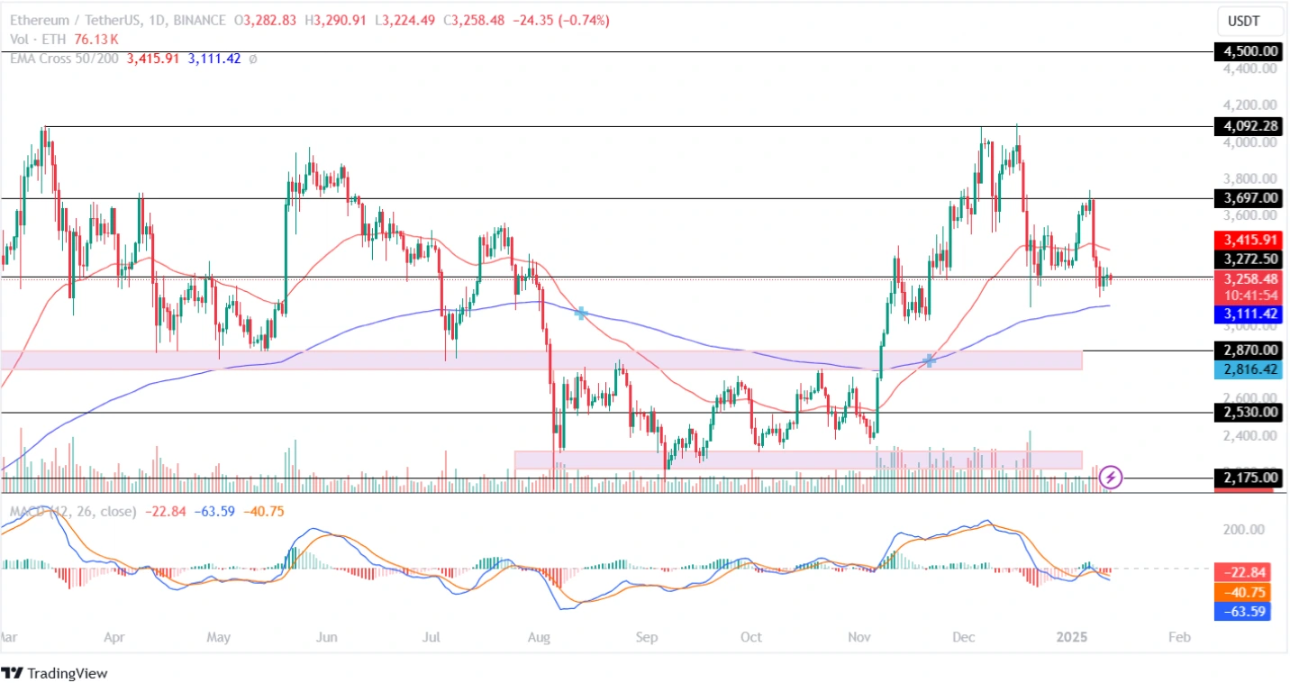 Ethereum siguió la tendencia de Bitcoin, perdiendo un 1.07% en las últimas 24 horas. Su volumen diario de operaciones se sitúa en 13.7 mil millones de dólares. El indicador de Convergencia/Divergencia de Medias Móviles (MACD) muestra un aumento en el histograma rojo, mientras que la Media Móvil Exponencial (EMA) ha realizado un cruce negativo con la línea de 50 días, indicando una mayor presión de venta.