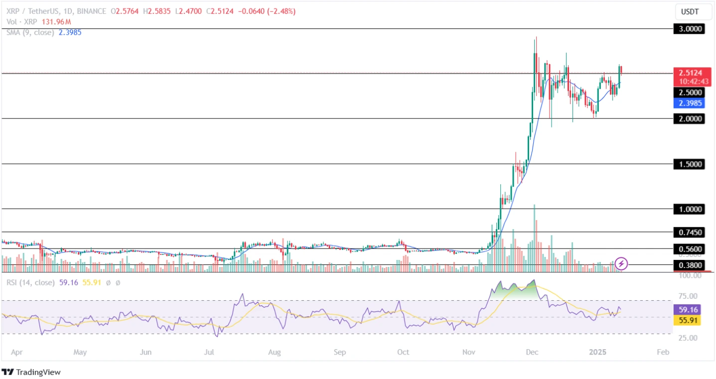XRP también ha experimentado una caída del 1.47% en las últimas 24 horas. Su volumen diario de operaciones alcanzó los 5.4 mil millones de dólares. En lo que va del año, el altcoin ha visto un aumento del 8.10% en su valor y actualmente se cotiza por encima de $2.50. Un posible cruce alcista en el indicador SMA sugiere que el precio podría volver a probar la marca de $3, mientras que una tendencia bajista prevaleciente podría llevarlo de nuevo a $2.