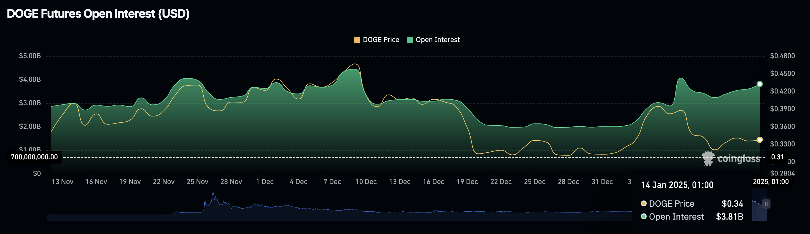 Esto lleva el interés abierto total en los contratos de futuros de DOGE a 3.81 mil millones de dólares a partir del 14 de enero, según datos de Coinglass.