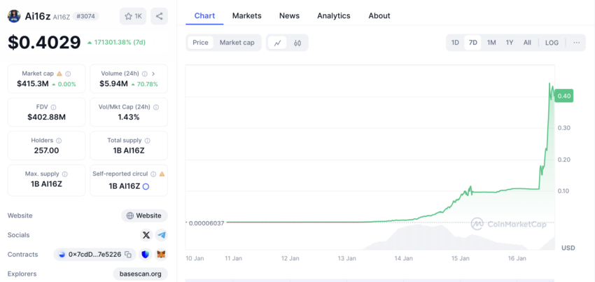 Por ejemplo, la escisión de la altcoin de inteligencia artificial altamente reconocida en el mercado, AI16Z, ha registrado un aumento del 171,190% desde su lanzamiento el 10 de enero. Es decir, se ha multiplicado aproximadamente 1,711x.