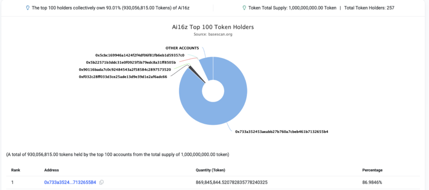 Los datos de SolScan muestran que este agente de IA tiene nada menos que 96,563 holders. Los 10 principales holders de tokens poseen el 29.12% del suministro total de la altcoin, un porcentaje ciertamente alto, pero significativamente más razonable que lo que observamos con su escisión.