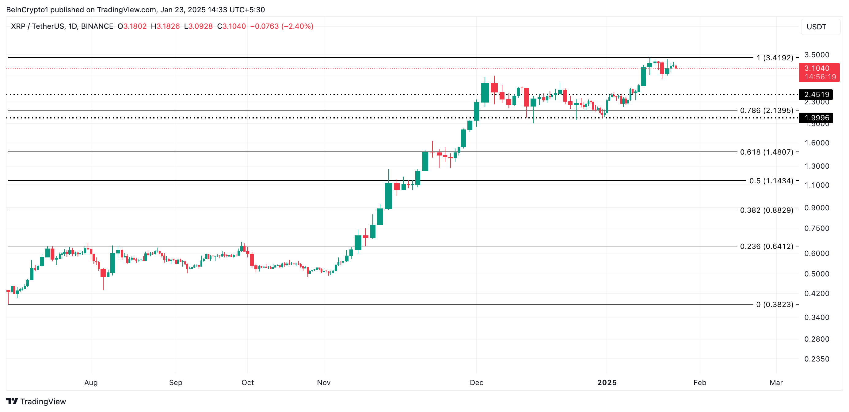 A medida que la actividad de venta gana impulso, el precio de XRP caerá aún más desde su máximo histórico. Según las lecturas de su herramienta de Retroceso de Fibonacci, el precio de la altcoin podría caer a un soporte en 2.45 dólares.