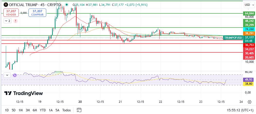 Sin embargo, en los días siguientes, TRUMP experimentó una corrección significativa, cayendo hasta los niveles actuales de $35,5, lo que equivale a una disminución del 52,9% desde su máximo.