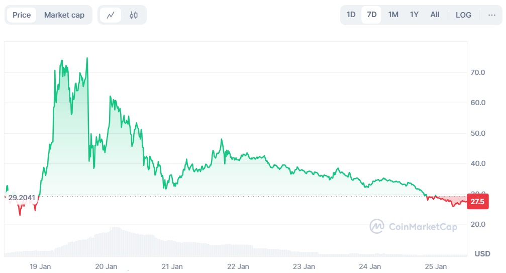 Sin embargo, a pesar del interés inicial que impulsó el precio de TRUMP más de 600% a un máximo de USD $75 el domingo, la memecoin del presidente ahora se ha desinflado cayendo más de 63% desde los niveles históricos.