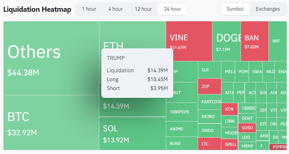 Solo en la última hora, el token TRUMP ha visto liquidaciones por más de USD $270.000, con la cifra ascendiendo sobre los USD $6 millones en un plazo de 12 horas.