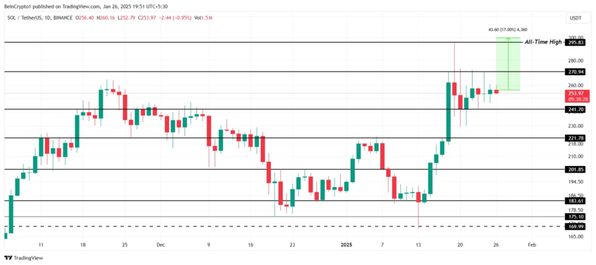 Al momento de escribir, Solana se negocia a 253 dólares, manteniendo un fuerte nivel de soporte en 241 dólares. El principal obstáculo para SOL es convertir el nivel de resistencia de 270 dólares en un piso de soporte, un movimiento que ha eludido a la altcoin hasta ahora.