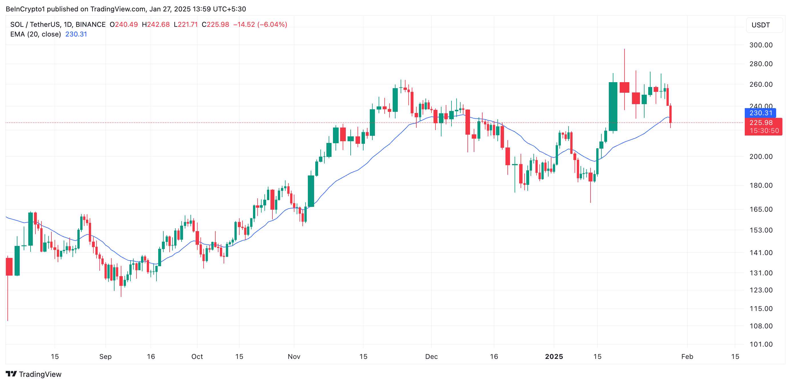 SOL cotiza a 226 dólares al momento de escribir este artículo, reflejando una caída del 9% en las últimas 24 horas. Esto ha empujado su precio por debajo de la media móvil exponencial (EMA) de 20 días, un indicador clave del impulso de debilitamiento.
