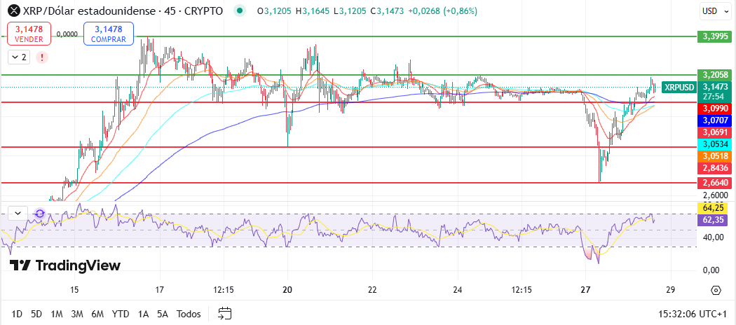 Desde una perspectiva técnica, XRP muestra un rebote significativo tras caer a $2,66 y repuntar hasta $3,21, un movimiento que podría fortalecer la confianza de los alcistas.
