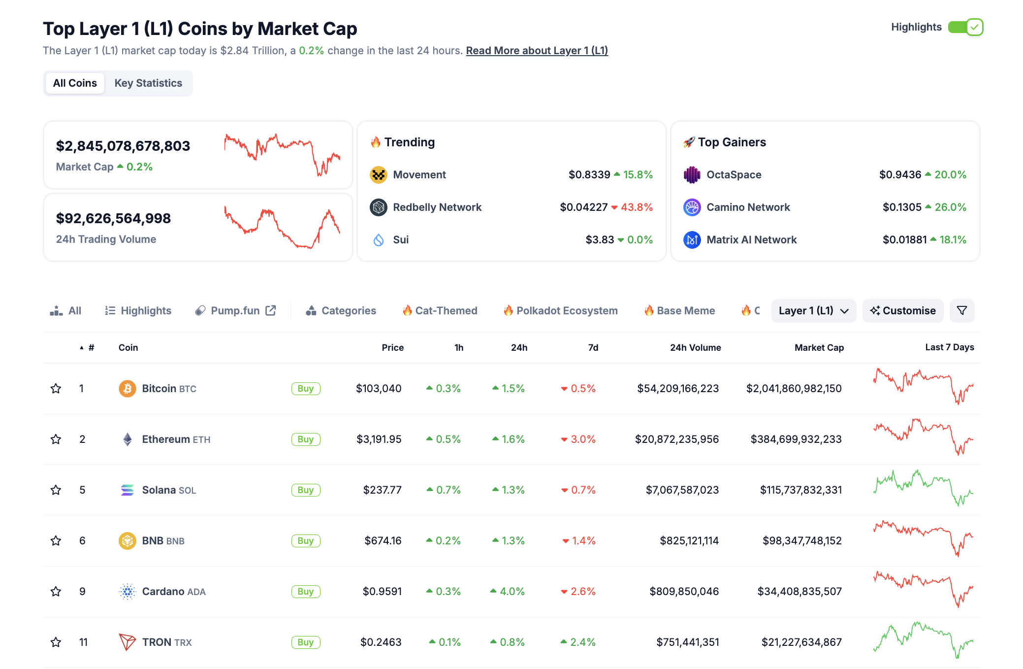 El sector de Layer-1 (L1) ha sido un impulsor significativo de la recuperación del mercado. Según datos de CoinGecko, al 28 de enero de 2025, la capitalización de mercado de L1 se sitúa en 2.84 billones de dólares, con un cambio del 0.2% en las últimas 24 horas.