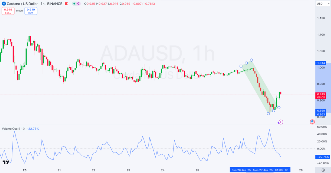 El gráfico horario de Binance muestra un descenso prolongado seguido de un rebote desde 0.869, respaldado por la señal de compra del TD Sequential. Además, el oscilador de volumen ha registrado un fuerte aumento en la actividad de trading, lo que generalmente indica una mayor volatilidad en el corto plazo.