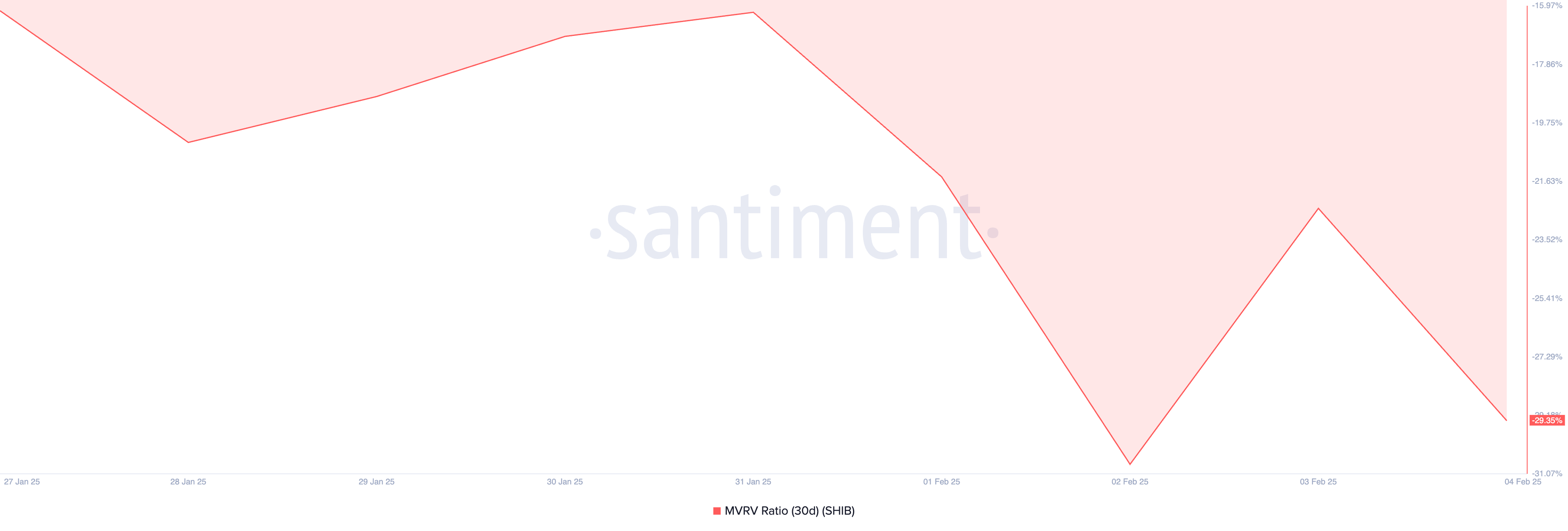 Una evaluación del valor de mercado de SHIB en relación con su valor realizado (MVRV) utilizando una media móvil de 30 días confirma su estado infravalorado. Según los datos de Santiment, este ratio es de -29.35% en el momento de la publicación.