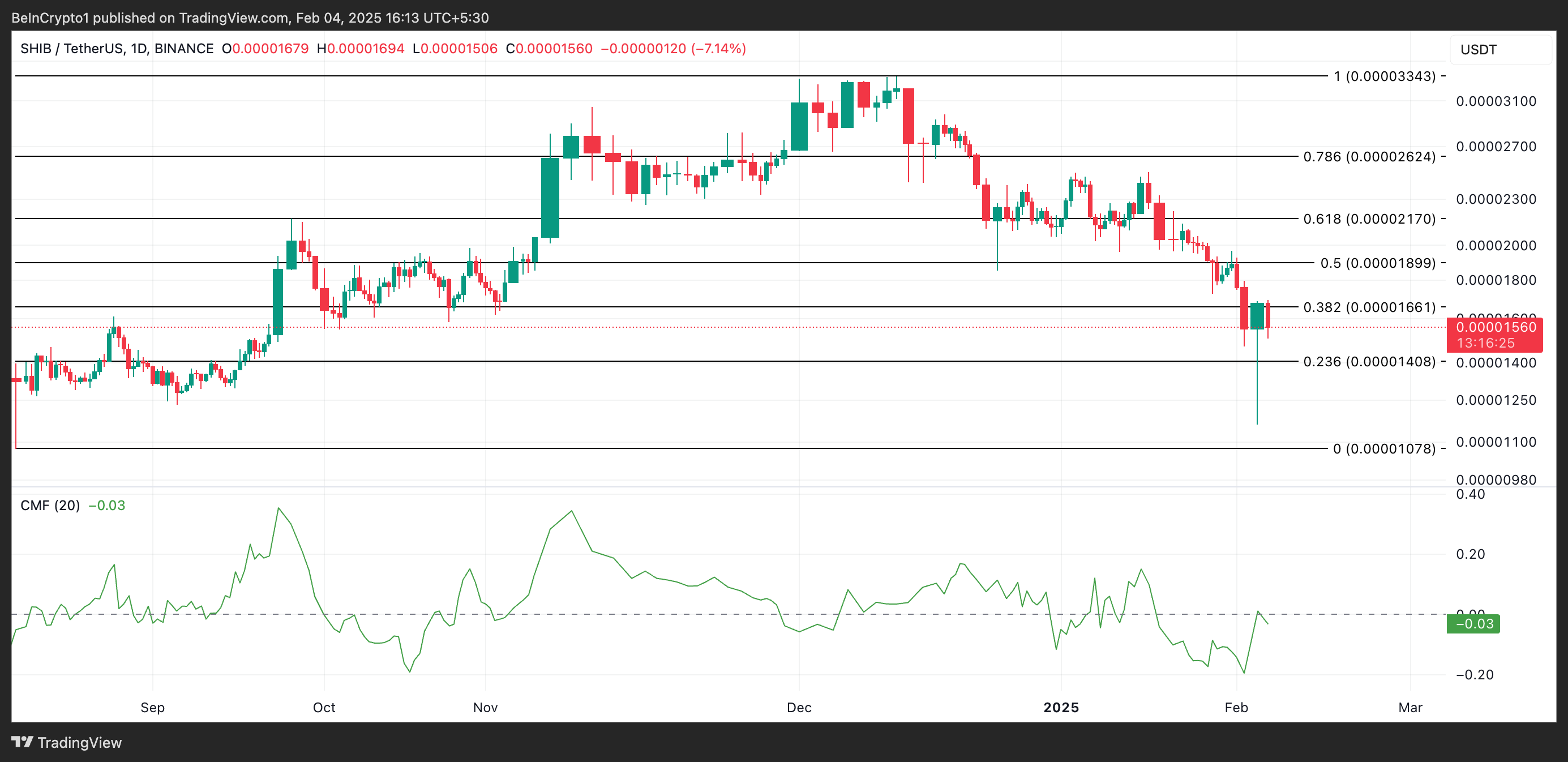 En el gráfico diario, el Chaikin Money Flow (CMF) de SHIB respalda la perspectiva bajista anterior. Al momento de escribir, el indicador CMF está por debajo de cero en -0.03, indicando una fuerte actividad de venta entre los traders.