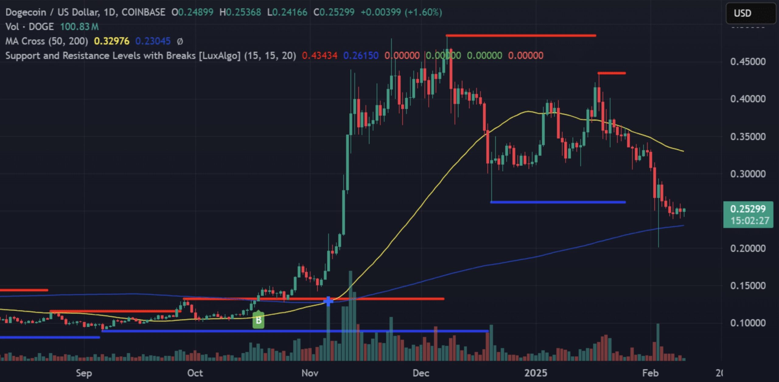 Actualmente, el próximo soporte significativo de $DOGE se encuentra en $0.23045, lo que podría actuar como una red de seguridad crítica para los comerciantes. Para que se materialice un escenario alcista, $DOGE debe mantener su posición por encima de este nivel y recuperar la media móvil de 50 días en $0.32976.