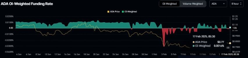 Según los datos de la tasa de financiación ponderada por OI de Coinglass, el número de operadores que apuestan a que el precio de ADA seguirá bajando es menor que el de los que anticipan un aumento de precio.